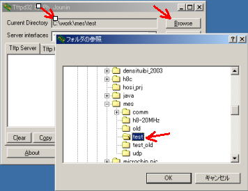 フォルダに変更します。ここでは 覚え書き7で作成したファイルを転送するので C:\work\mes\test に設定しています。