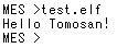 test.elfはHello Tomosan!と表示するだけのプログラムなので、
