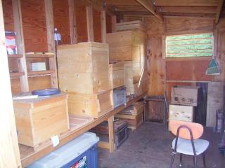 蜂舎の中はこんな感じになってます。奥の窓は金網が張ってあって、ミツバチは通れてスズメバチは入れません。