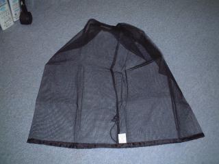 黒くて目の細かい網を筒状にしてあり、上はゴムでしぼってあります。下は紐で絞れるようになっています。