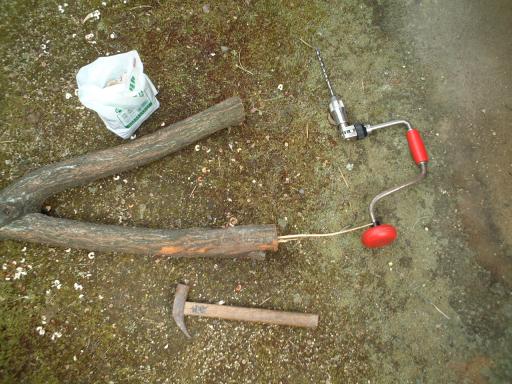 火の番していても暇なので、この前切り出した木に椎茸の菌を植える。白い袋の中が菌のついた「駒」。右のドリルで穴をあけて、駒を金槌で打ち込む。
