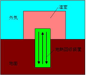 昼間は温室の熱を地下に運んで室内の気温上昇を抑え、夜間は地熱を温室内に運んで気温降下を抑える原理です。