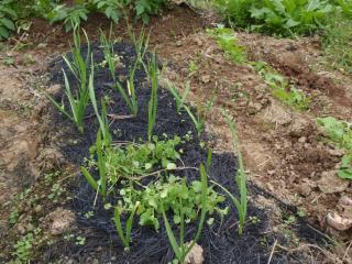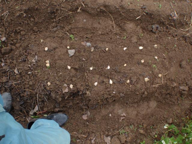 畝幅1.2m、株間12-15cm、条間30cmで、芽の出る方を上に向け深さ3-5cmに植付けます。