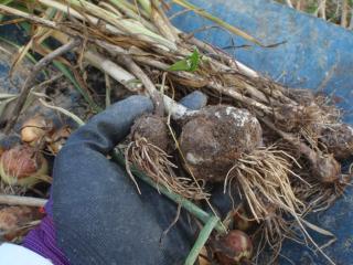 根を切って日陰の風通しの良い軒下などに4-6球ずつ束ねて吊るし、貯蔵します。