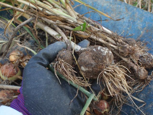 収穫は晴天で土の乾いた時に抜き取り、畑で2-3日乾燥させ、その後、