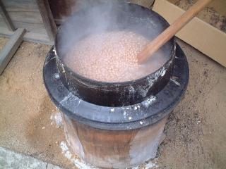 大豆を煮ているところ。前日に1日かけて煮込むのですが、 私は仕事だったので女房とじいさんが煮てくれました。