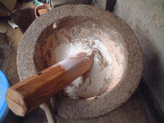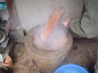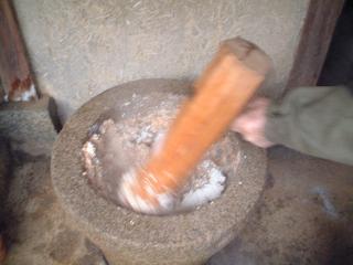 大豆を適量づつ臼に入れて潰します。今年はよく煮込んだようで大豆が柔らかく、 簡単につぶれました。