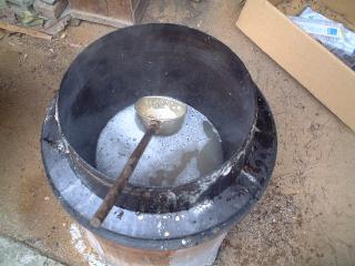 程よくつぶれたところで麹と塩を投入。よく混ぜます。 はがまの中からどれくらい豆を出したのかよくわからないので、 どのくらいの麹と塩を入れてよいのかわからず、困りましたが、 じいさんの目分量でやってみたらうまくゆきました。