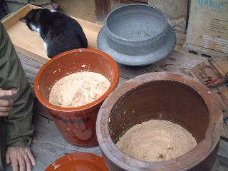 臼に6回ほど分けて作業して終了。はがまも空になりました。米麹とひしお麹、 二つに分けて甕にいれました。これで今年の仕込み終了。毎年やってるとだいぶ慣れてきて、 今年ははやく終わりました。