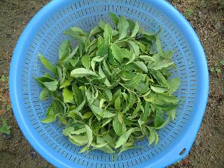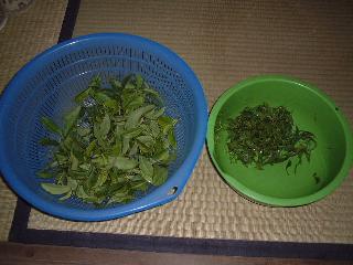 摘み取った葉っぱ。本には夜露が消えてから、と書いてあったのですが、待ちきれずに収穫。