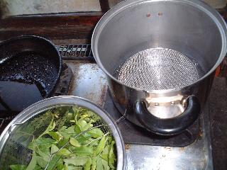 容器はスパゲッティの鍋を利用。葉っぱの半分を蒸しました。残りは紅茶作り用に発酵させるため、そのまま放置。