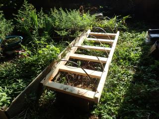風通しがよいように、梯子状の構造にして、割竹を上に付け、寒冷紗をかけても空間が空くようにしました。