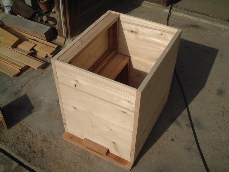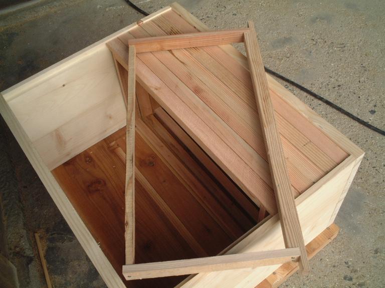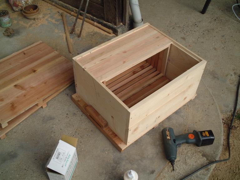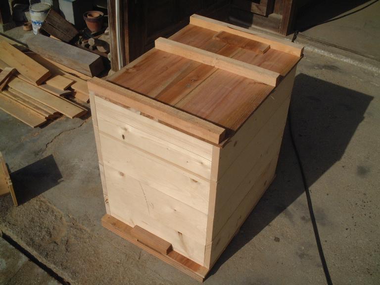 フタをはずしたところ。外箱それぞれに巣枠10枚づつ入ります。外枠はホームセンターで購入した1×6材を使いました。板厚19mmで、市販の巣箱より厚いです。底板は6寸の杉板と1寸角の角材を使っています。