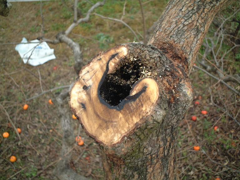 赤裸にします。皮を剥くと虫や病原菌の入る隙間がなくなるので、柿の健康状態を良好に保つことができます。 農薬を使うより、まずは皮むき作業をした方が効果的と聞いています。
