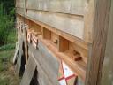 蜂舎外から見た巣箱。一番手前が日本ミツバチ。他は全て西洋ミツバチ。