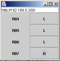 引数をhttp://192.168.0.200/modify.cgi?RB7=H にするとRB7端子がHighになり、LEDが点灯します。この端子にスイッチがついていればスイッチONになります。