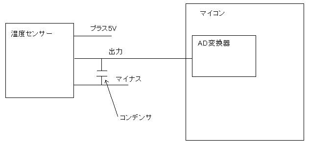 CCDの温度を計測できるように、温度計を準備しましょう。準備するものは温度センサー、コンデンサー。温度センサーの出力はマイコン内臓のADコンバーターに繋いでデジタル化します。回路は下図。