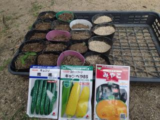 ポットに種まき。他にキュウリ、カボチャも同時に蒔いてみます。