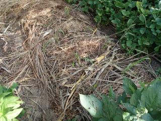 芽を出したので畑に定植しました。暑く、乾燥する季節なので、周りに枯れ草を敷き詰めています。